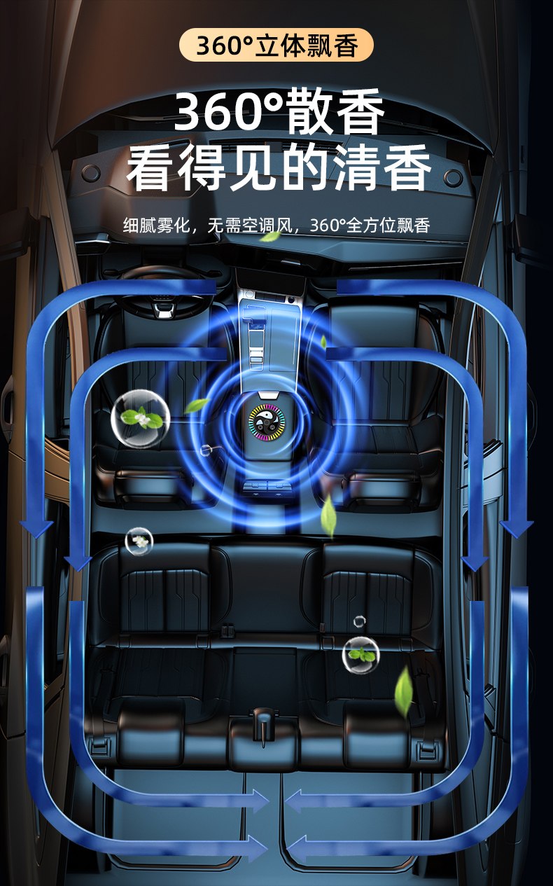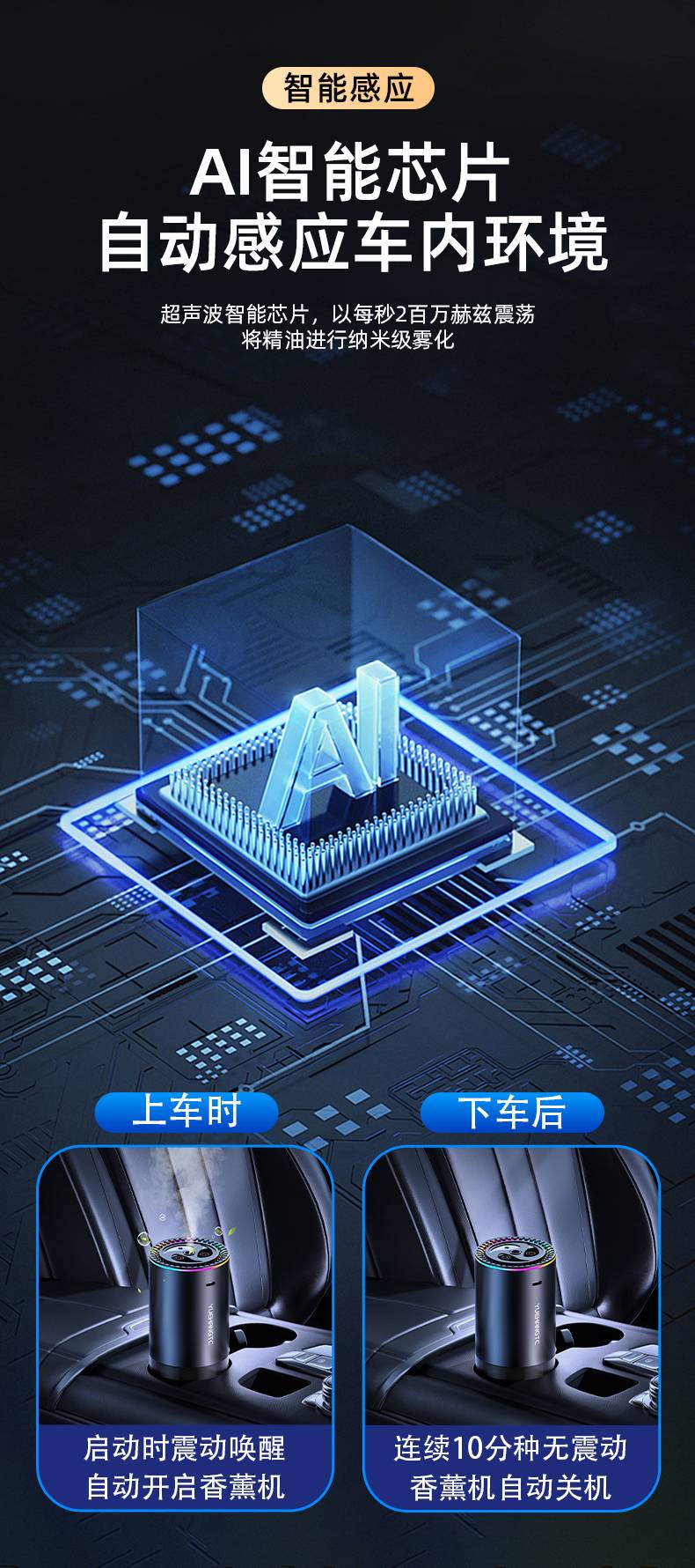 7. Intelektualus jutiklis AI intelektualioji mikroschema automatiškai aptinka ultragarsinį intelektualųjį lustą automobilio aplinkoje ir nanoskalėje purškia eterinius aliejus su 2 milijonų hercų per sekundę vibracija