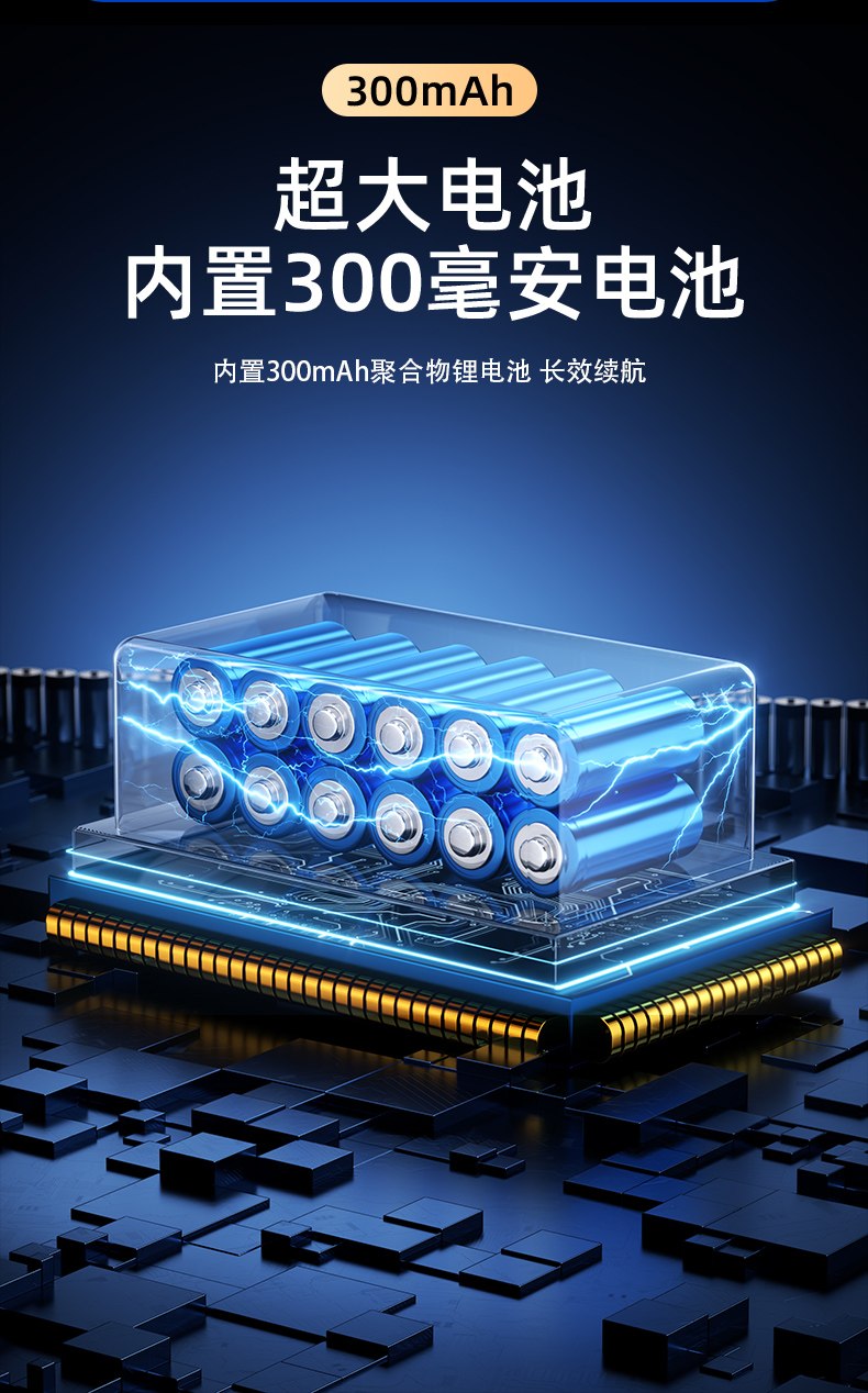 9 300 mAh didelė baterija su įmontuota 300 mAh baterija ir 500 mAh polimero ličio baterija, užtikrinanti ilgalaikę ištvermę